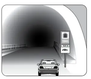 Şekildeki gibi yeterince aydınlatılmamış tünele giriş yapan aracın sürücüsü aşağıdakilerden hangisini yapmak zorundadır?